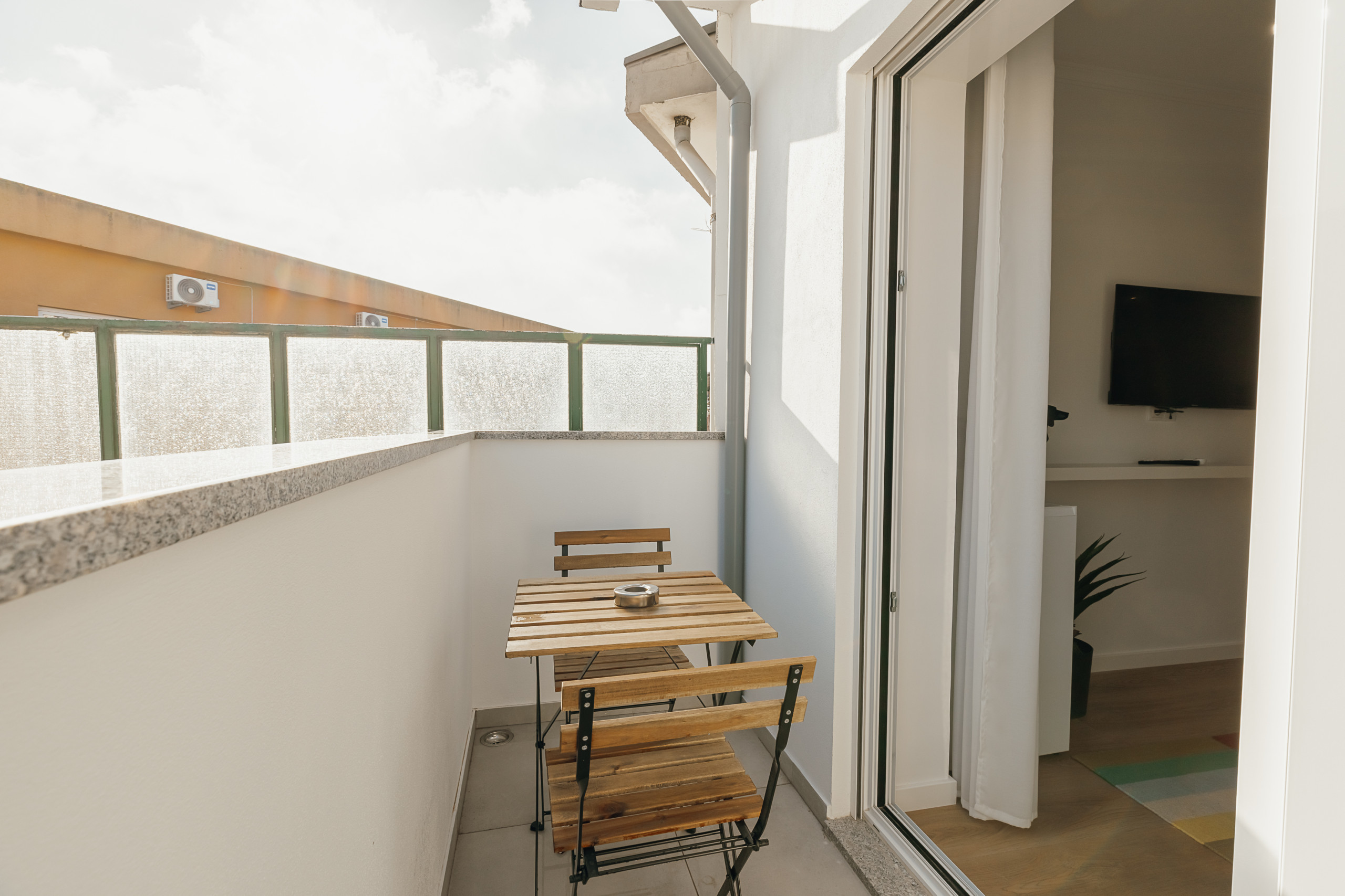 Dispõe ainda de uma pequena varanda privativa, equipada com uma mesa e duas cadeiras, perfeita para tomar um café pela manhã ou relaxar ao final do dia.