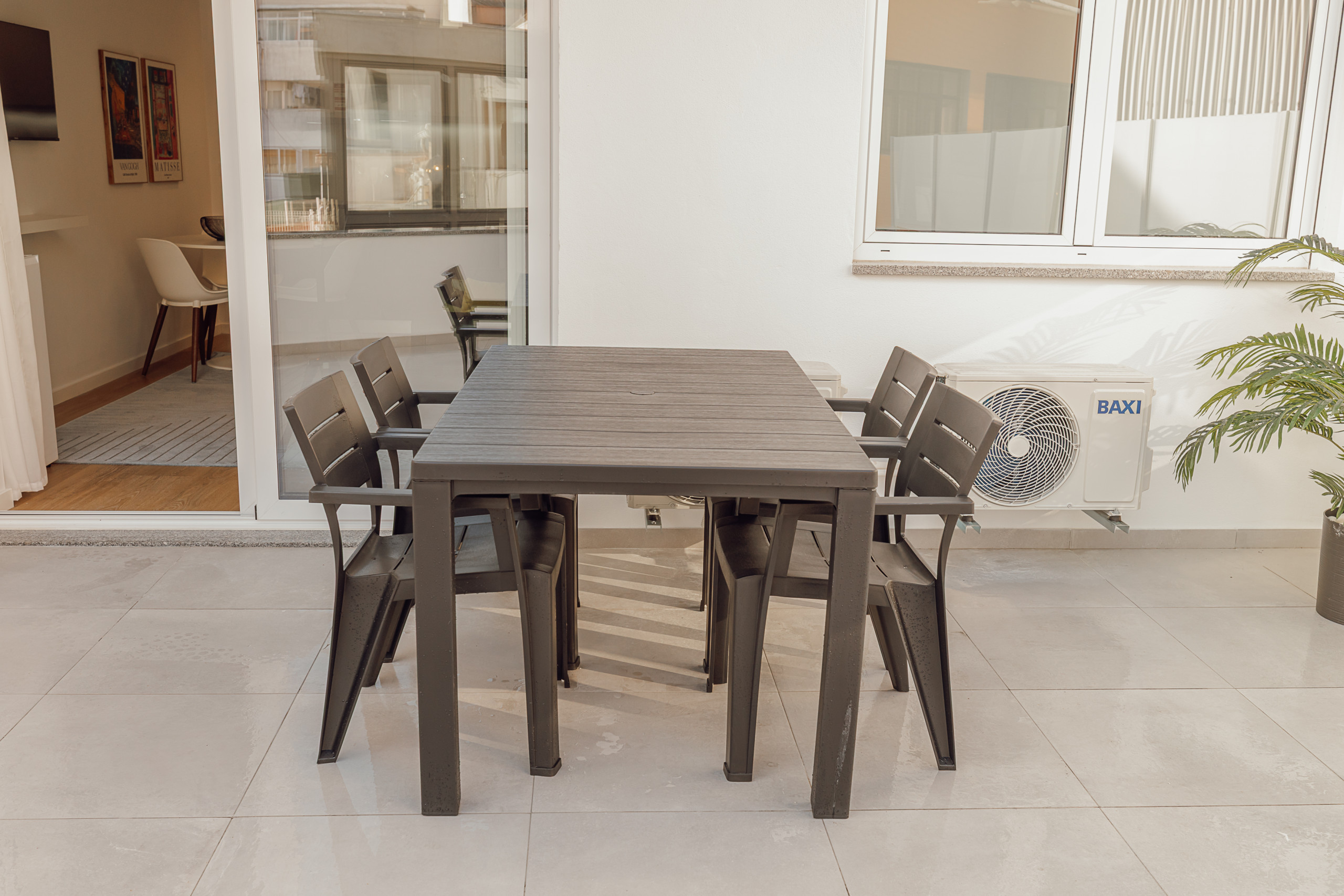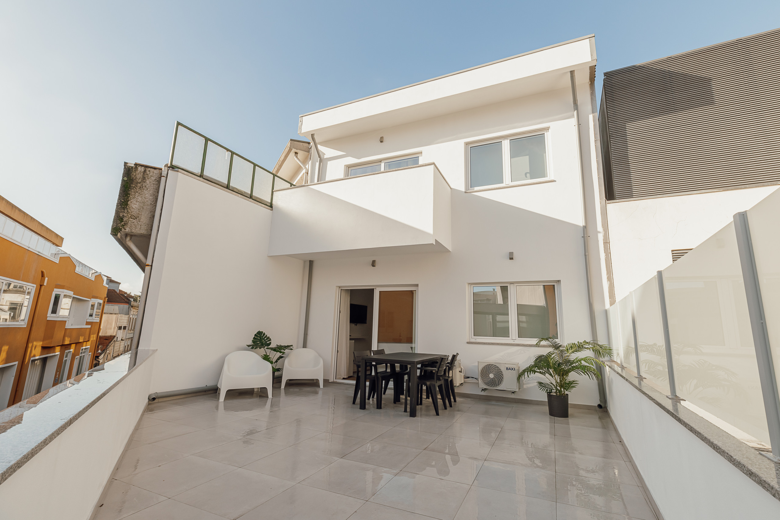 Um dos pontos altos do apartamento é o terraço privado, equipado com mesa e cadeiras, perfeito para tomar o pequeno-almoço ao ar livre ou desfrutar de momentos tranquilos ao final do dia.
