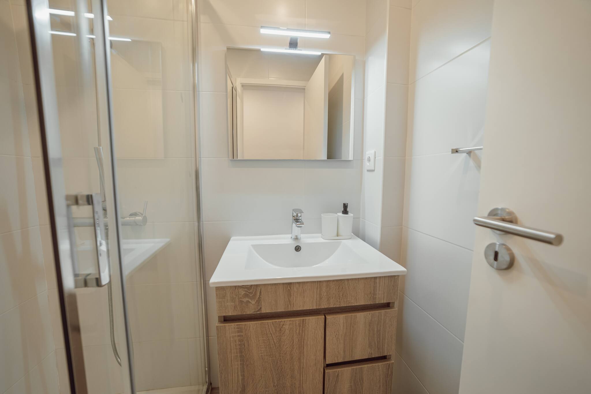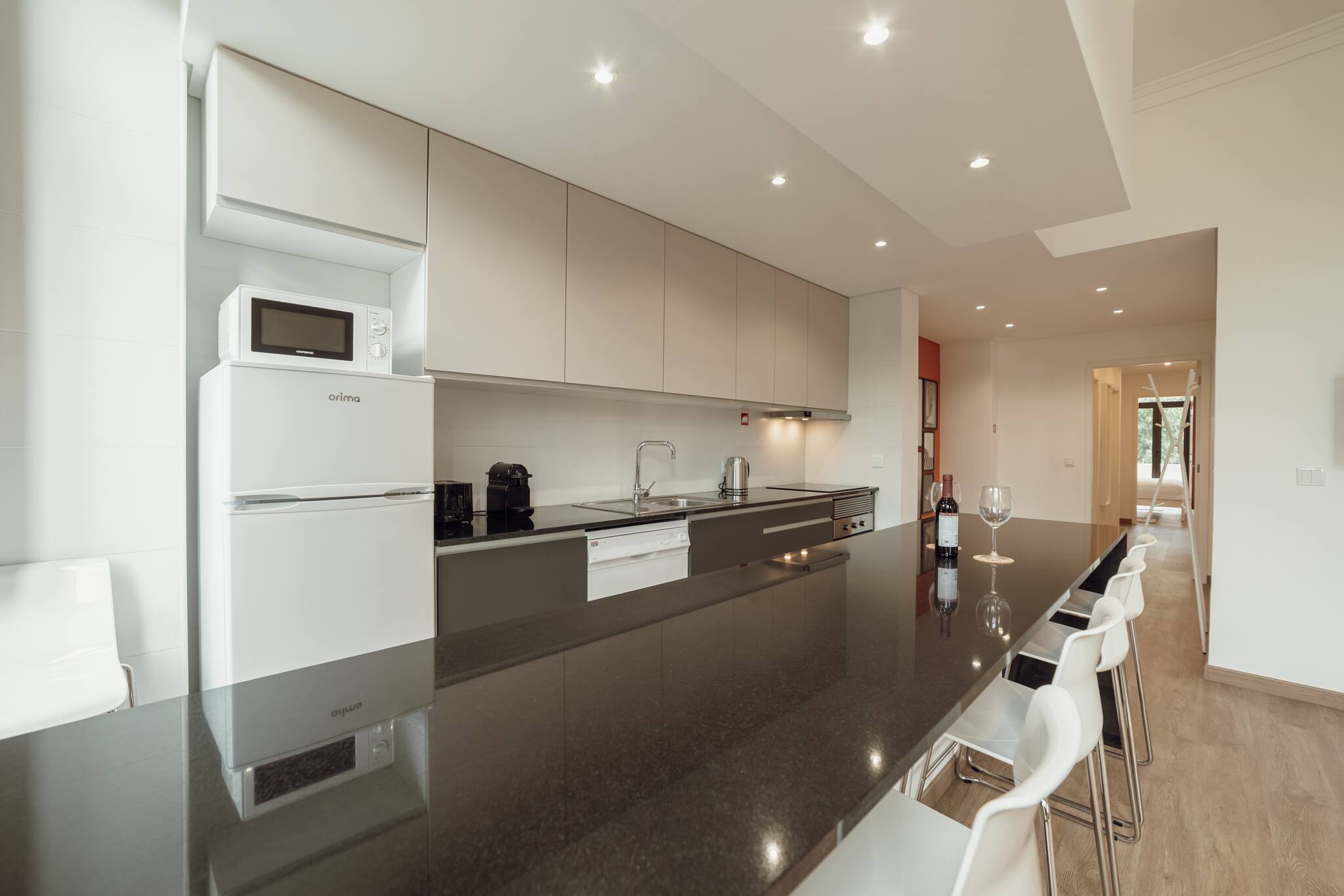 A cozinha em ilha, com conceito americano, é totalmente equipada com máquina de lavar louça e máquina de café, ideal para refeições práticas ou um café relaxante. Para o seu entretenimento, o apartamento conta com TV e Wi-Fi de alta velocidade.