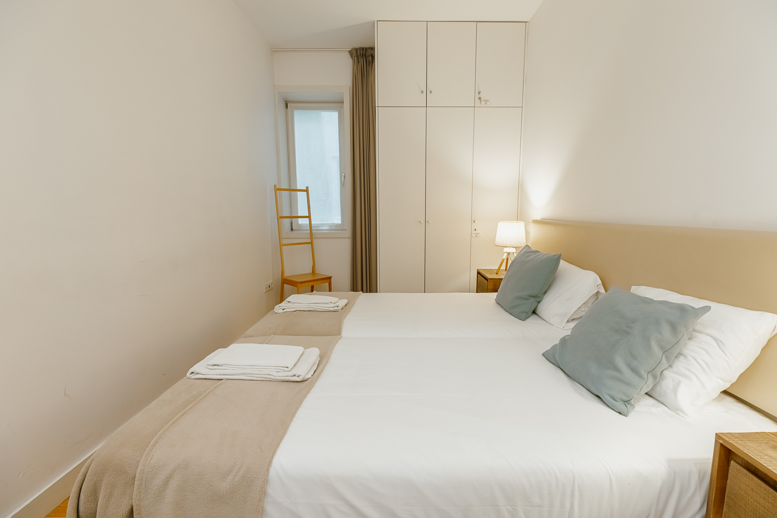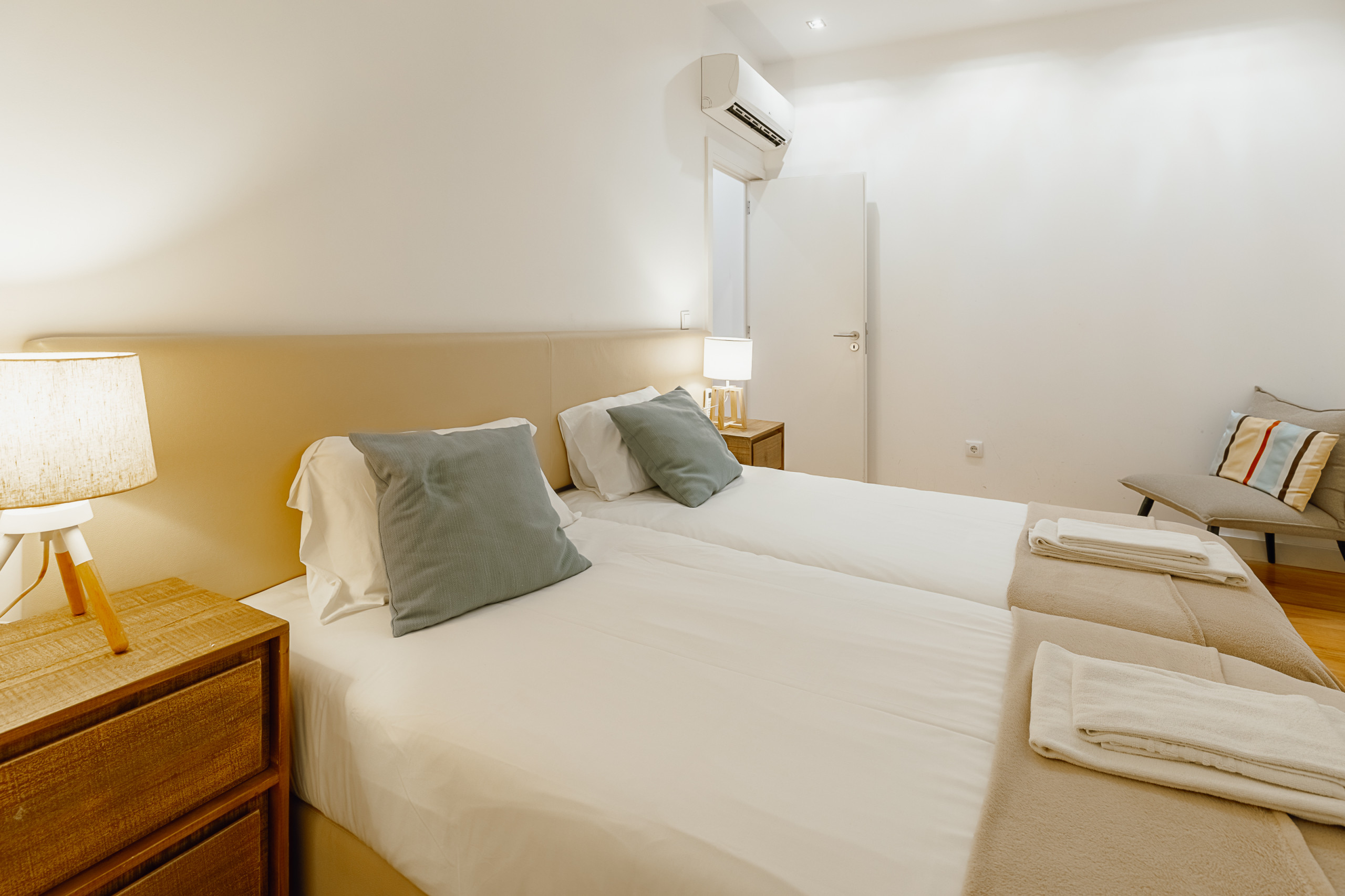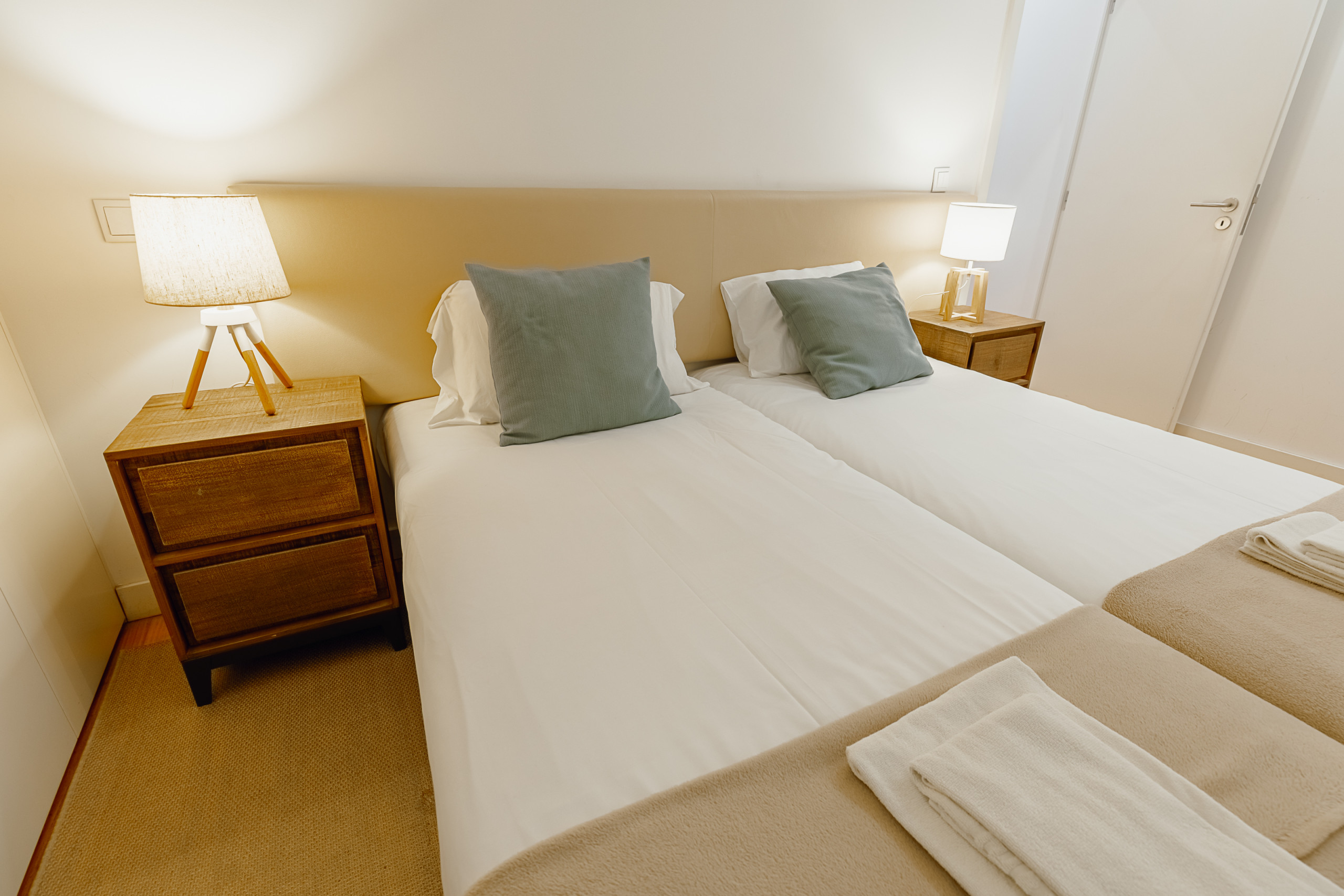 O espaço possui um quarto com duas camas individuais, perfeito para amigos, colegas ou viajantes que preferem dormir separadamente. A área social num espaço de conceito aberto integra a sala de estar e a cozinha totalmente equipada, com todos os eletrodomésticos e utensílios essenciais para preparar refeições confortavelmente. A sala de estar também inclui um sofá-cama individual, permitindo o alojamento de até três pessoas no total.