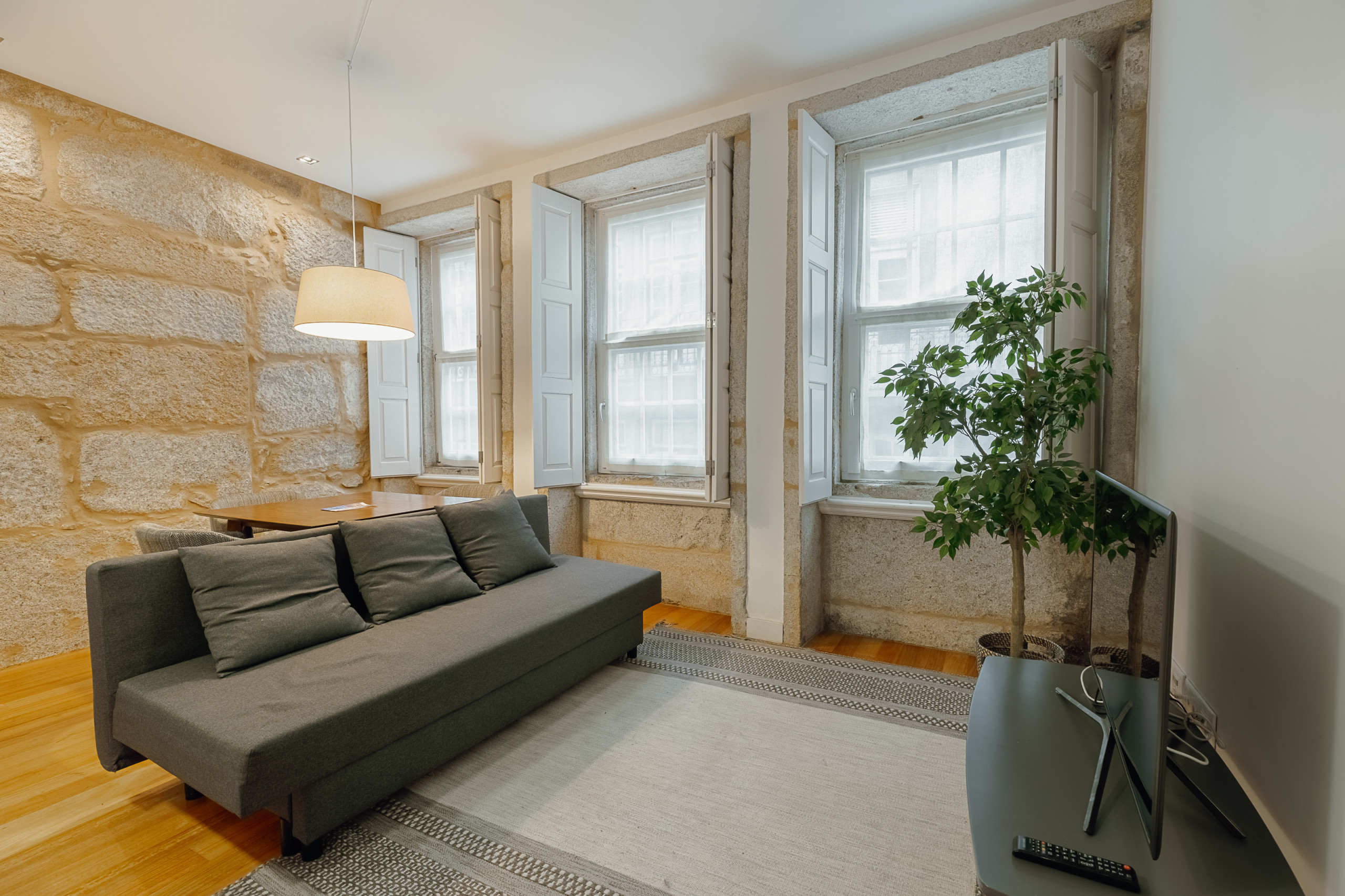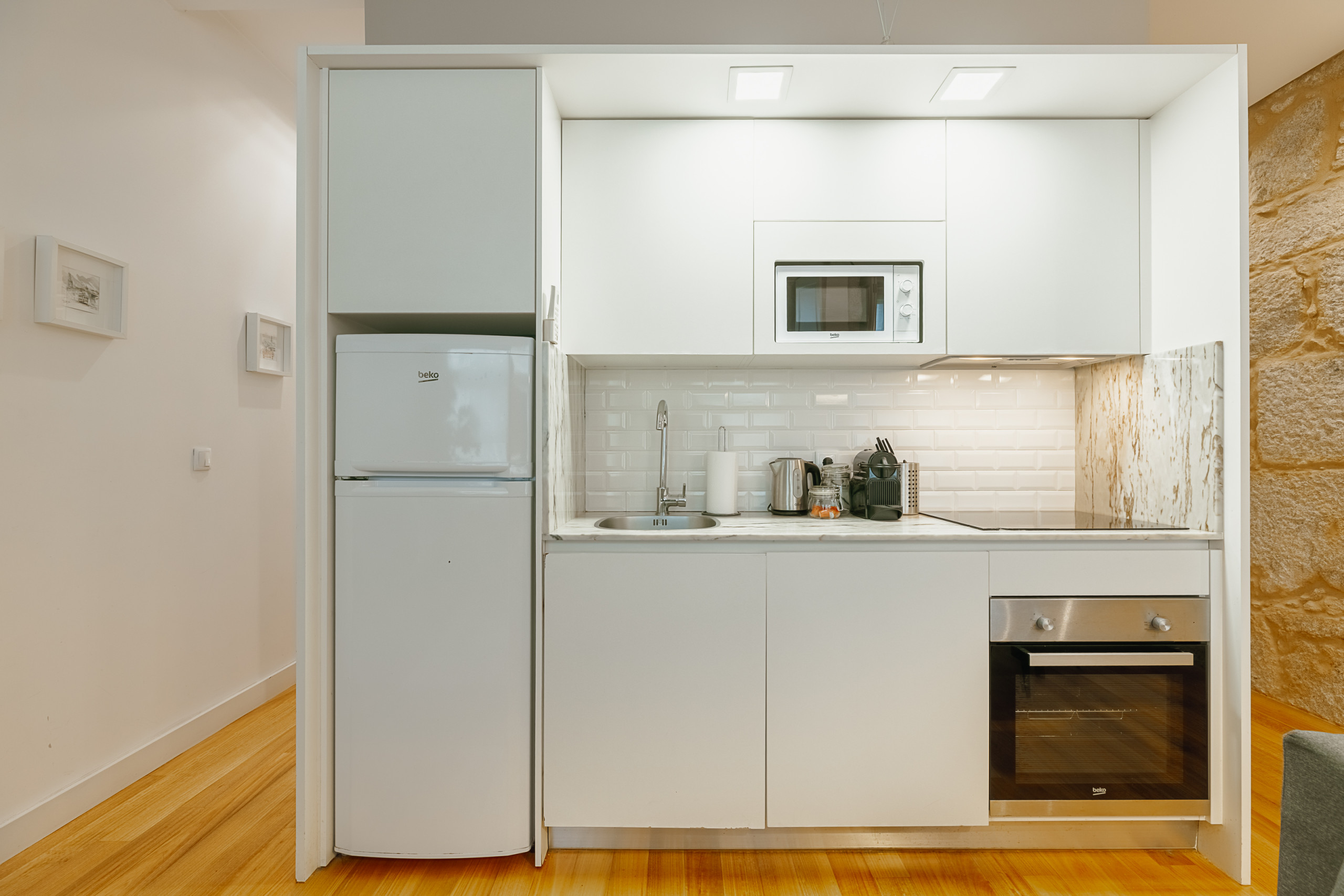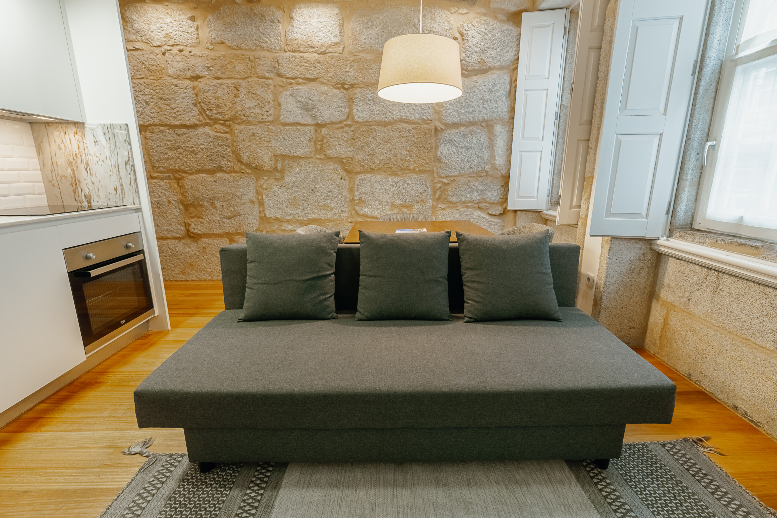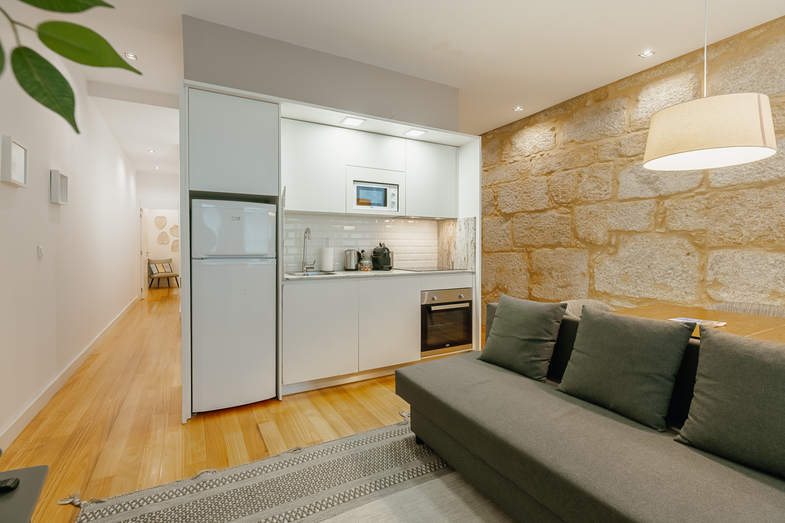 O design geral realça uma atmosfera aberta e arejada, reforçada pela simplicidade da disposição. Uma mistura perfeita de forma e função, este estúdio na Rua da Constituição oferece um santuário elegante e confortável para quem procura um espaço de vida contemporâneo no coração do Porto.