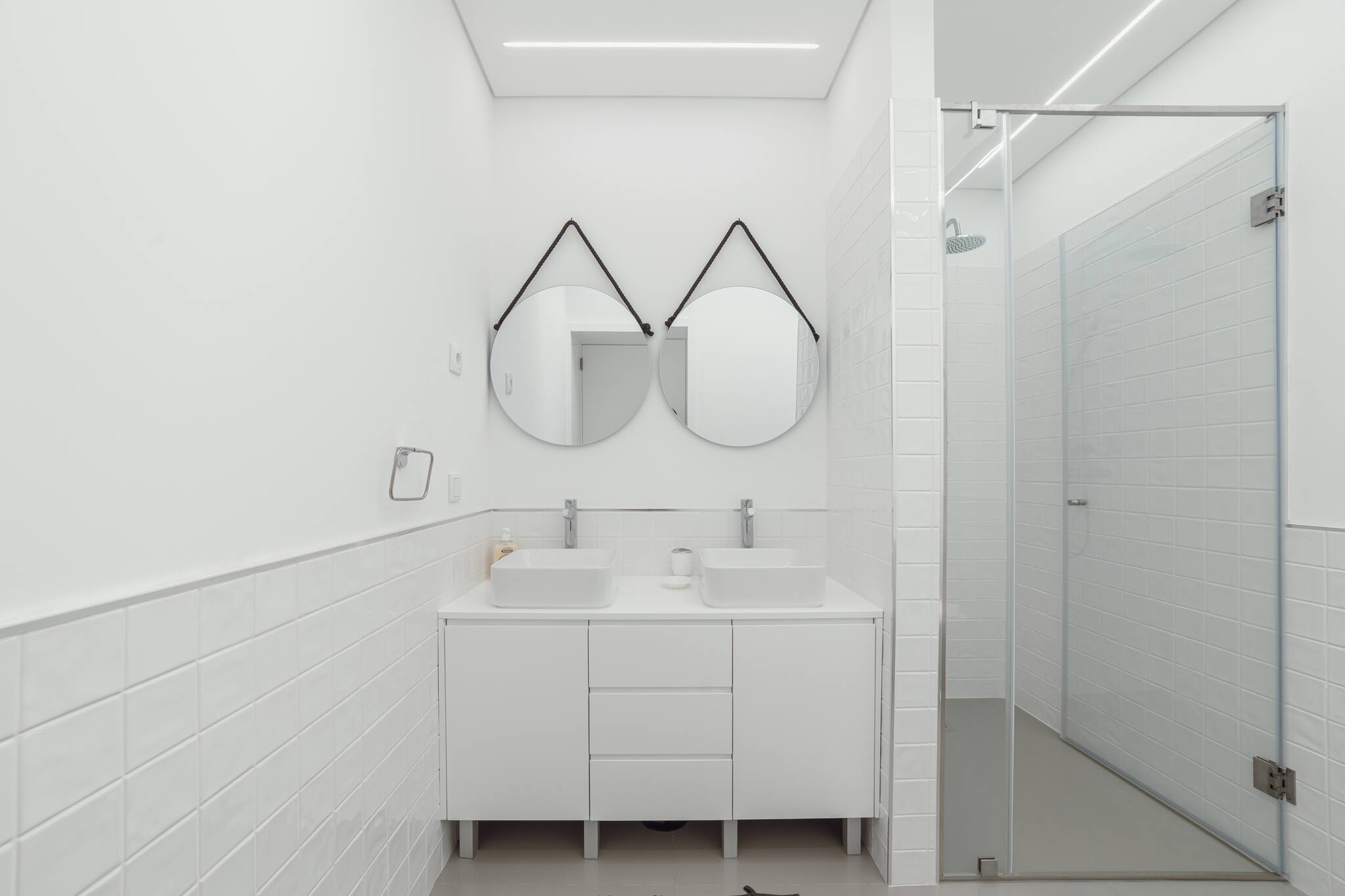 Esta casa conta com duas suítes luxuosas, cada uma projetada para máximo conforto e privacidade. As suítes são generosamente dimensionadas, com grandes janelas que permitem que a luz natural ilumine o ambiente. Os três banheiros são elegantemente decorados, oferecendo uma experiência com acessórios modernos e decoração de bom gosto.