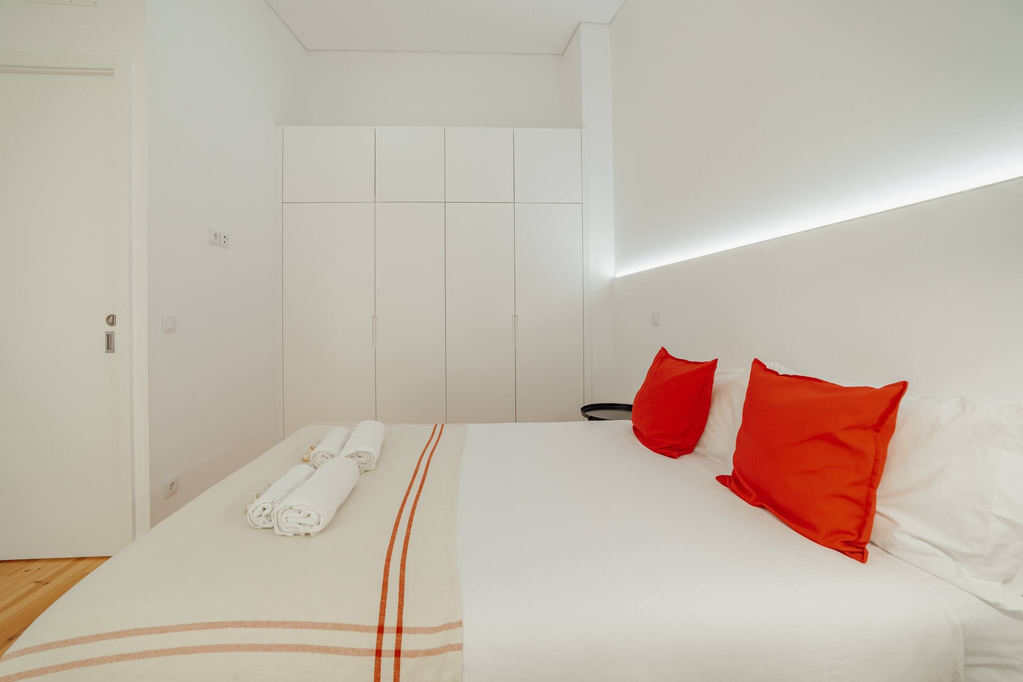 Um quarto fica no rés do chão e tem uma cama King (190 cm x 200 cm) e o segundo quarto fica no segundo andar e tem uma cama Queen (150 cm x 200 cm). Um sofá-cama e uma cama dobrável separada (80 cm x 200 cm) estão disponíveis para acomodar hóspedes adicionais.