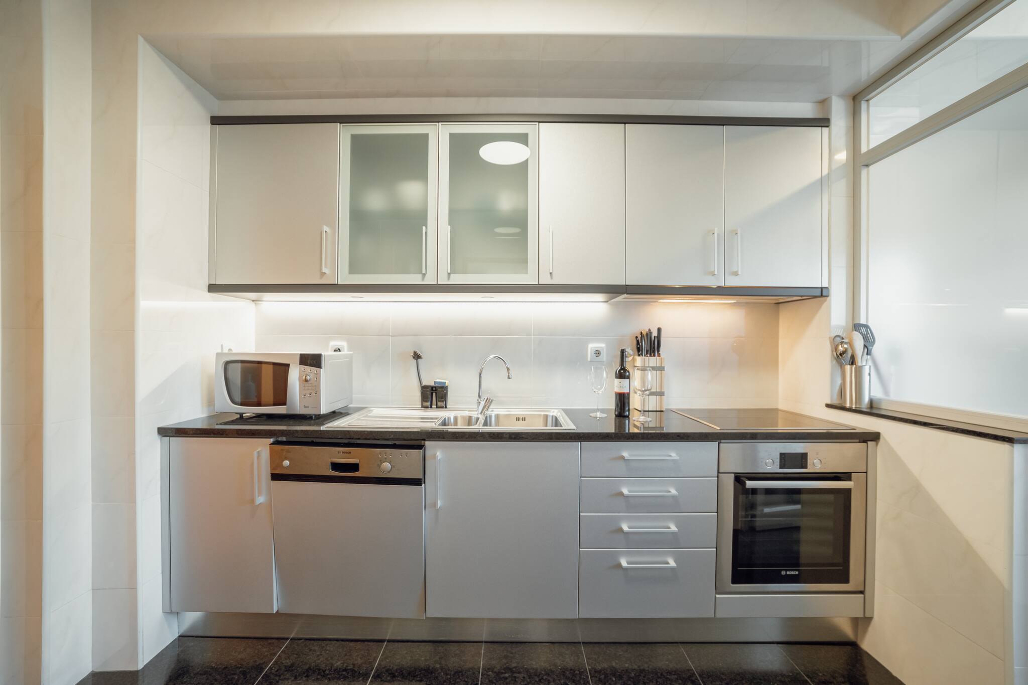 The spacious kitchen, fully equipped, is ready for your culinary efforts, with modern appliances and a wide counter space. An adjacent laundry area (washing and drying machine) adds practicality to daily life.