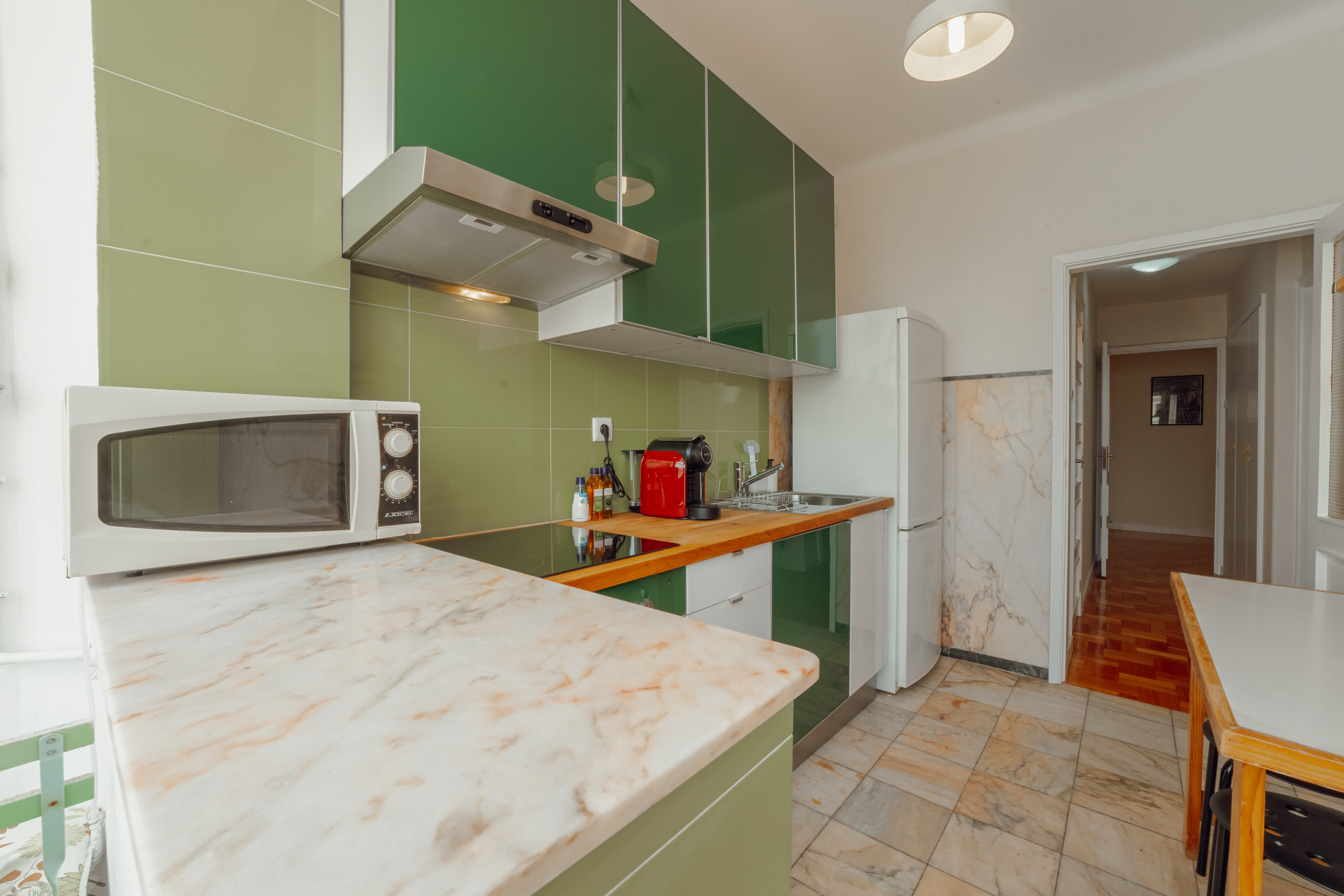 The apartment features two double beds and a sofa bed, offering a perfect rest after a day of sightseeing. The fully equipped kitchen, with a washing machine, dishwasher, and coffee machine, ensures convenience for preparing meals or simply relaxing.
