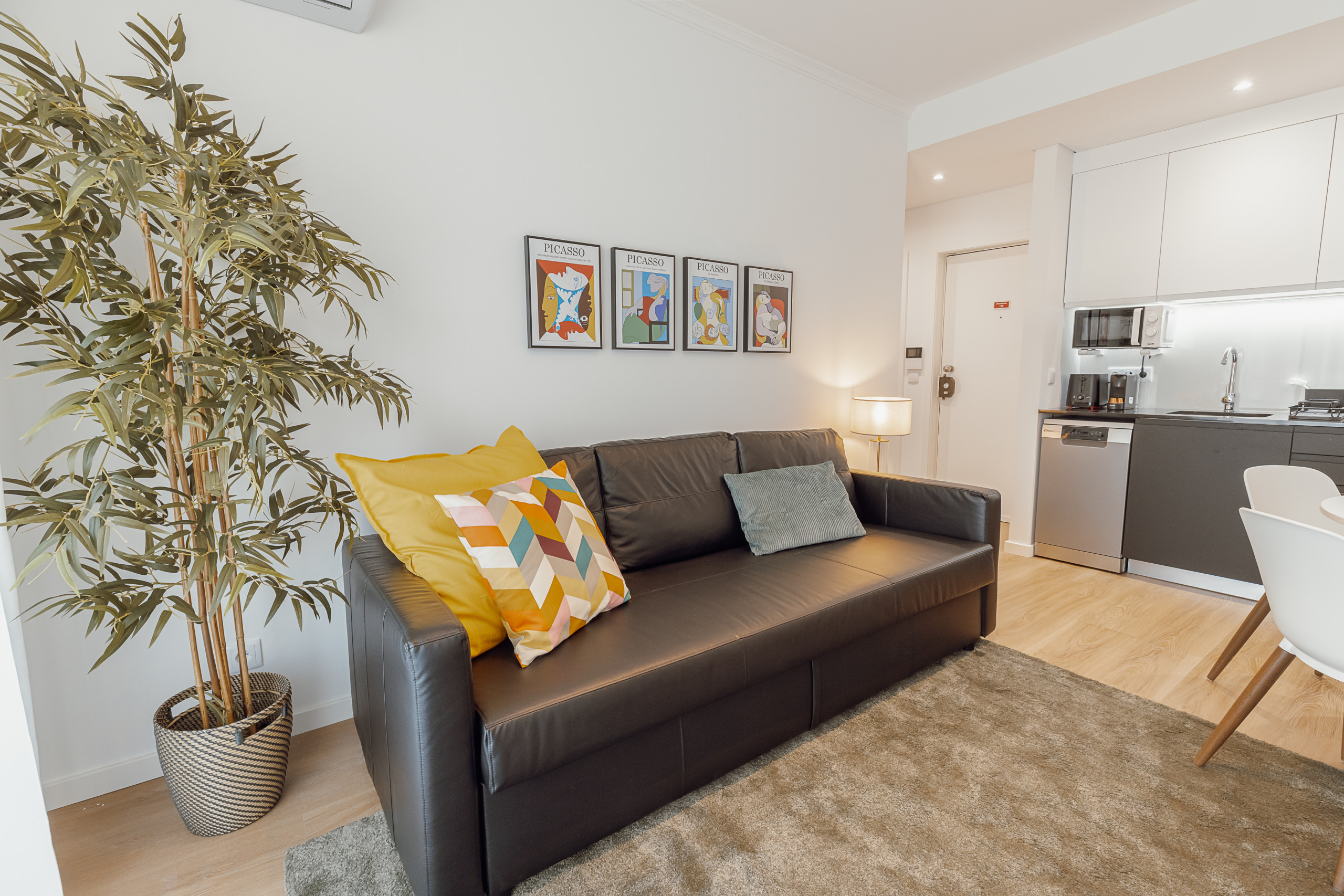 The apartment consists of a bedroom with a double bed, a bathroom with a shower, and a social area in an open space, which integrates the living room and kitchen. The kitchen is fully equipped, including a dishwasher, refrigerator, stove, microwave, utensils, and coffee machine, ideal for those who like to prepare meals at home. The living room has a sofa bed that accommodates up to 2 people, offering extra flexibility for families or small groups.