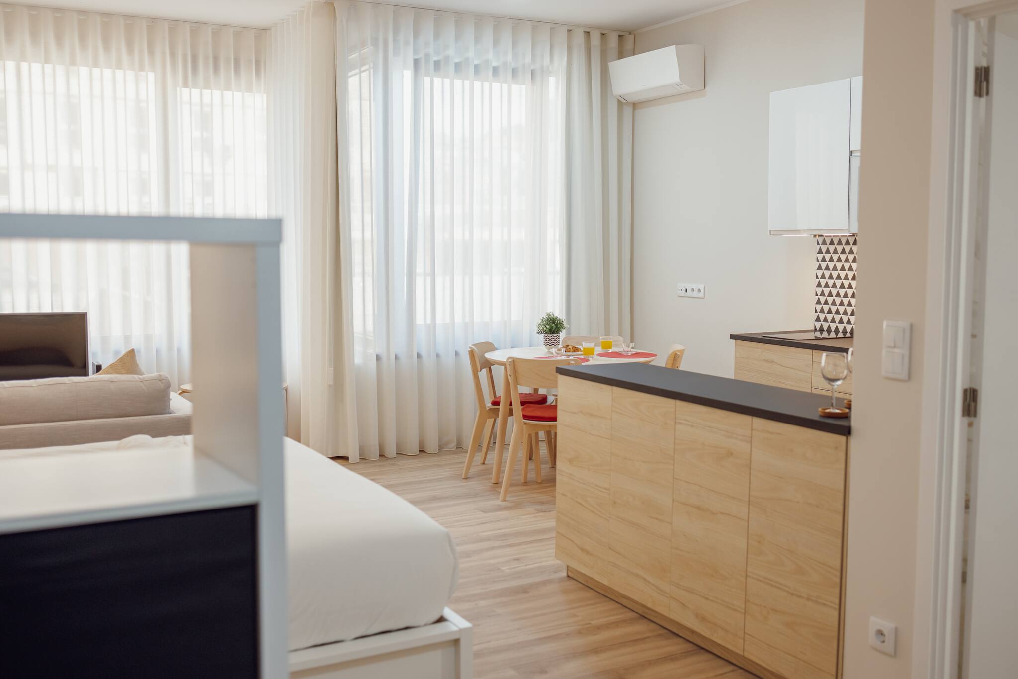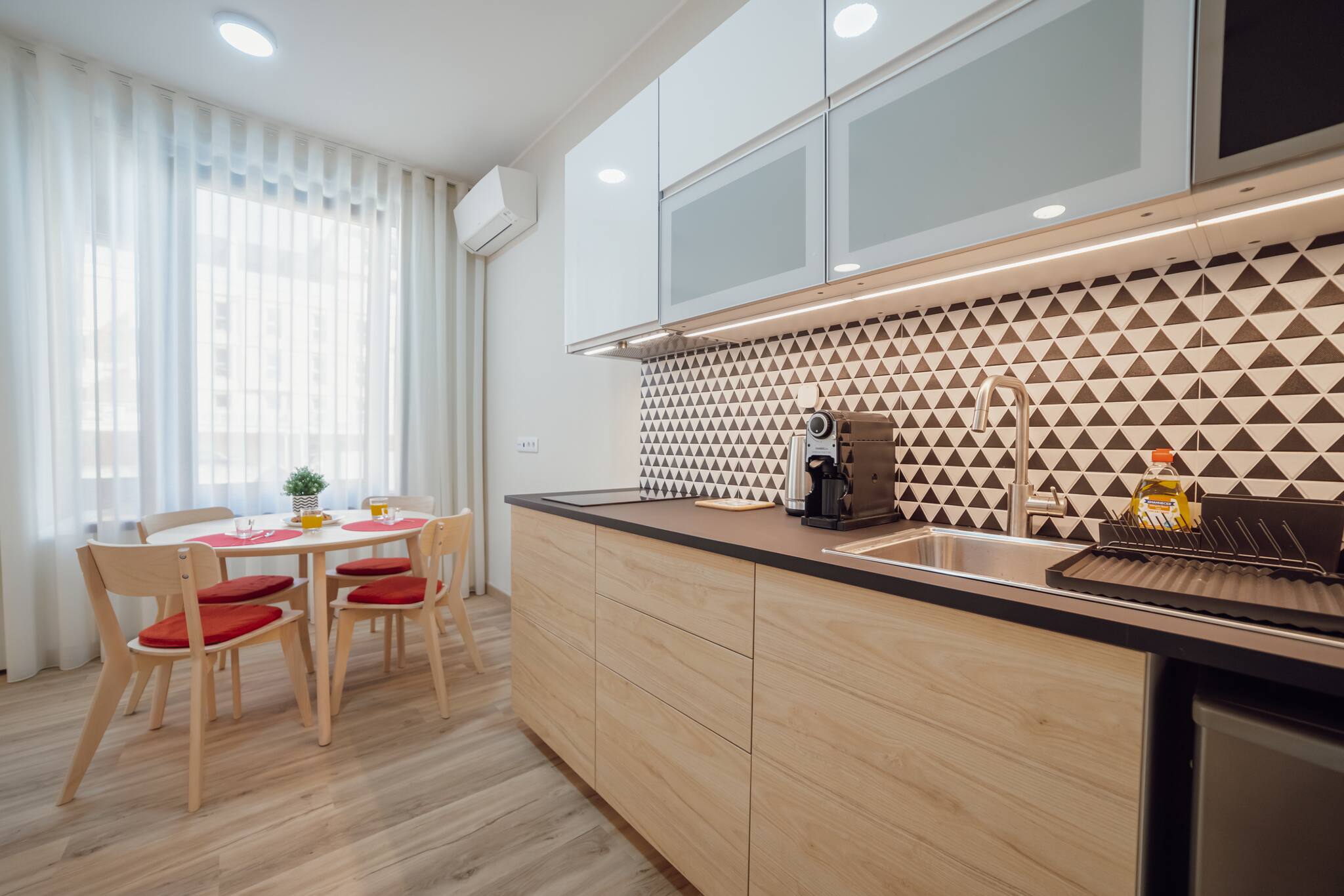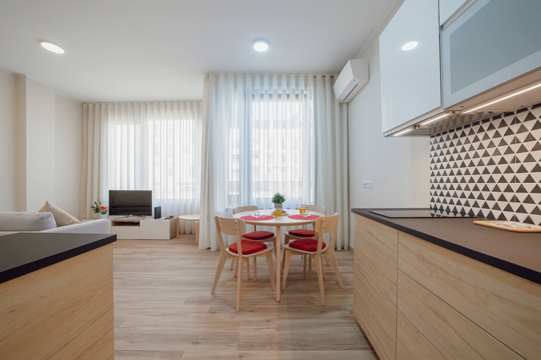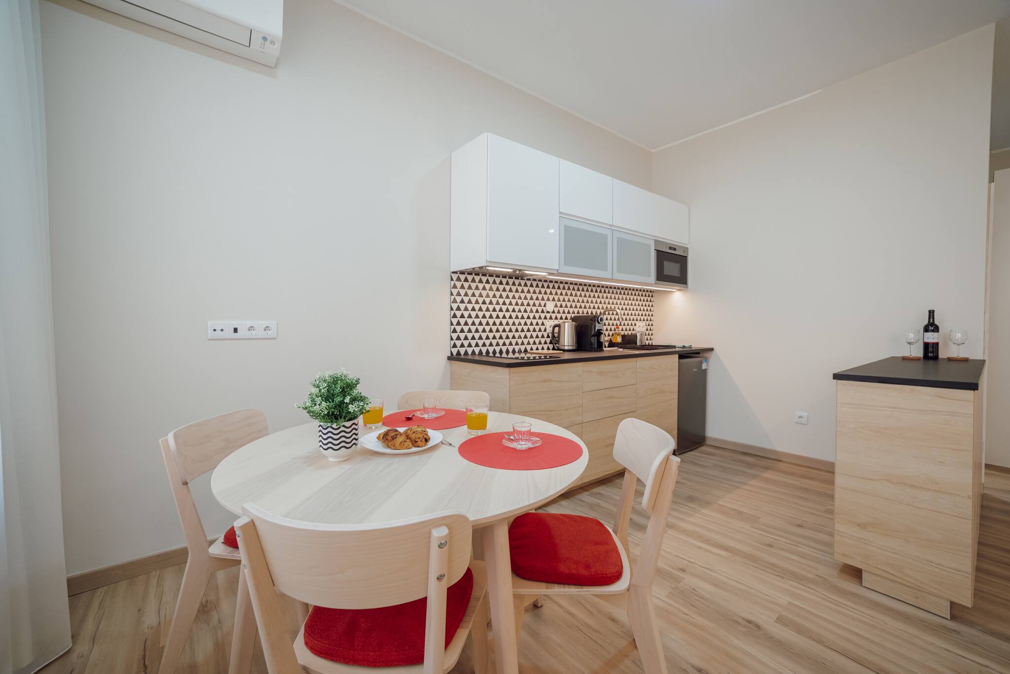 The kitchenette, equipped with an induction hob, refrigerator, microwave, oven, freezer, dishes and cutlery, kitchen utensils, coffee maker, toaster, electric kettle, and stove, provides all the necessary amenities to prepare your meals. Additionally, the balcony offers a pleasant space to relax and enjoy the city view.